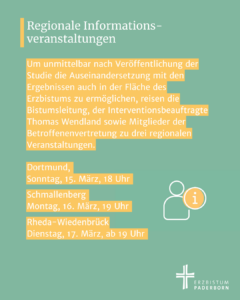 In den darauffolgenden Tagen lädt die Bistumsleitung zusammen mit dem Interventionsbeauftragten und Mitgliedern der Betroffenenvertretung zu drei regionalen Dialogveranstaltungen ein: