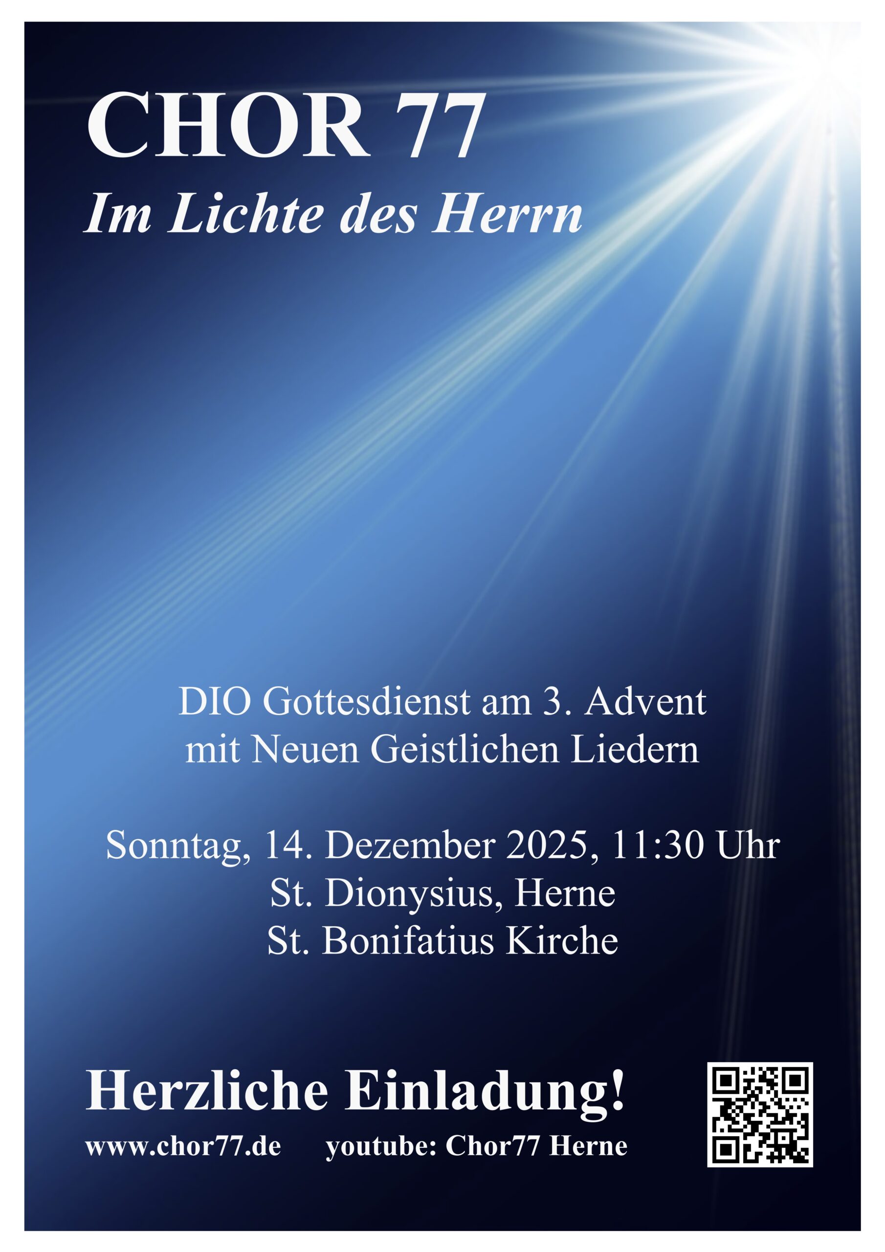 Der Chor 77 unter der Leitung von Johannes Rau lädt herzlich zu einem musikalisch gestalteten Gottesdienst mit Neuen Geistlichen Liedern in die St. Bonifatius Kirche ein.