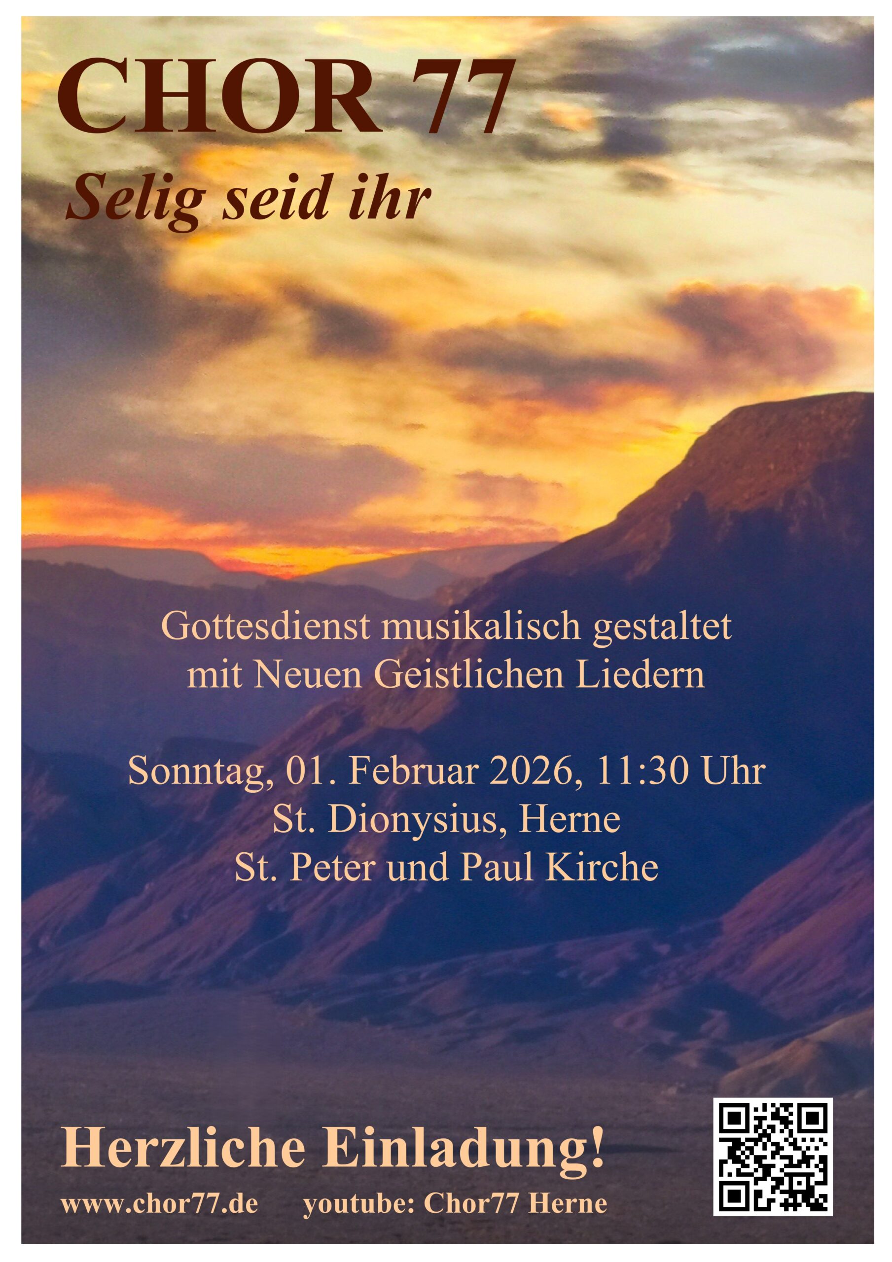Der Chor 77 unter der Leitung von Johannes Rau lädt herzlich zu einem musikalisch gestalteten Gottesdienst mit Neuen Geistlichen Liedern in die St. Peter und Paul Kirche ein.